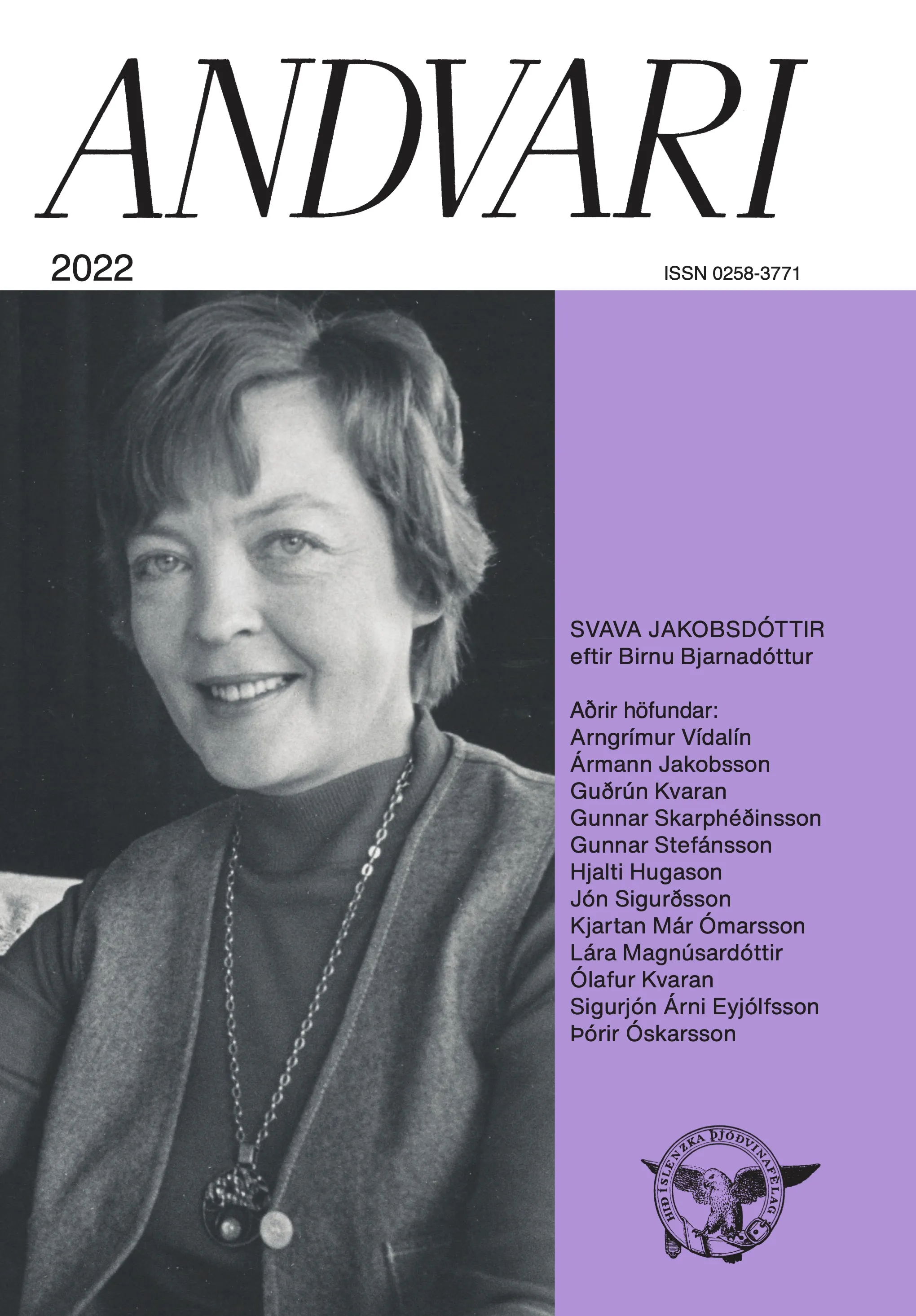 Aðalgrein Andvara 2022 er æviágrip Svövu Jakobsdóttur rithöfundar og alþingismanns. Höfundar ritsins 2022 eru Birna Bjarnadóttir, Guðrún Kvaran, Gunnar Stefánsson, Lára Magnúsardóttir, Hjalti Hugason, Arngrímur Vídalín, Ólafur Kvaran, Þórir Óskarsson, Kjartan Már Ómarsson, Sigurjón Árna Eyjólfsson, Gunnar Skarphéðinsson og Jón Sigurðsson.