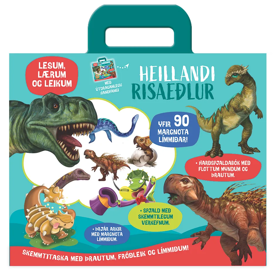 Taskan geymir harðspjaldabók með flottum myndum, þrautum og fróðleik, spjald með skemmtilegum verkefnum og útdraganlegu handfangi og yfir 90 margnota límmiða.