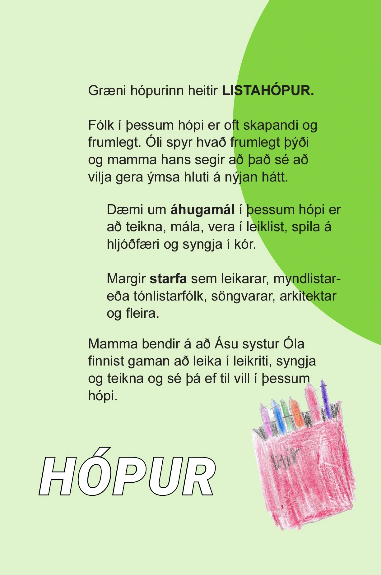 Óli er 10 ára strákur sem langar að læra um áhugamál. Hann lærir um 6 hópa í ýmsum litum með allskonar skemmtilegum áhugamálum og störfum.