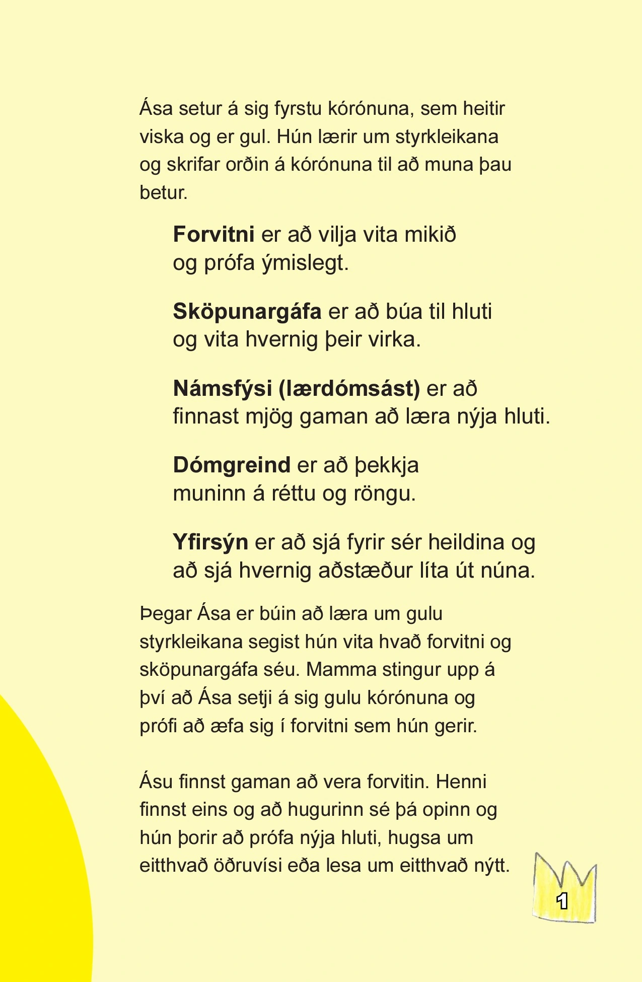 Ása sem er 8 ára stelpa langar að læra um styrkleika. Mamma hennar kennir henni sniðugan leik með kórónur í ólíkum litum. Bókin er fyrir 6-12 ára börn til að læra að þekkja sig betur og finna styrkleikana sína.
