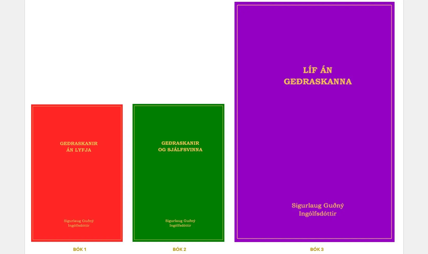 Höfundur bókanna tók þá ákvörðun að takast á við geðraskanirnar án lyfja og hefur því aldrei tekið kvíða-, þunglyndis- eða svefnlyf, heldur sótti í leiðir þar sem unnið var með flækjustigin á meðvitaðan hátt.