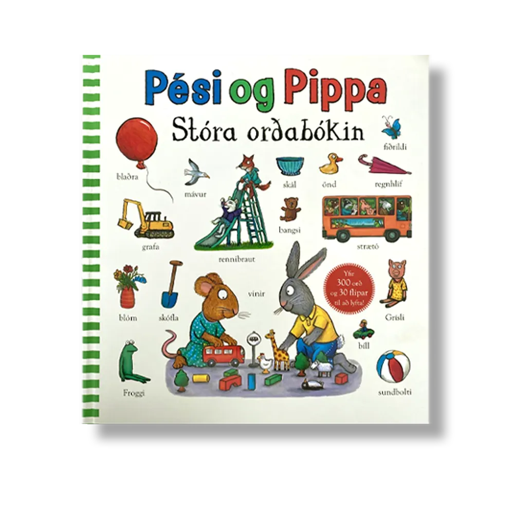 Stóra orðabókin er ríkulega myndskreytt bók með vinum okkar, Pésa og Pippu. Á hverri opnu er að finna verkefni og orð úr daglegu lífi sem leiða til samtals og málörvunar. Yfir 300 orð og 30 flipar fyrir litla fingur að fletta. Setberg bækur fyrir börn.